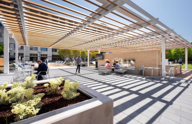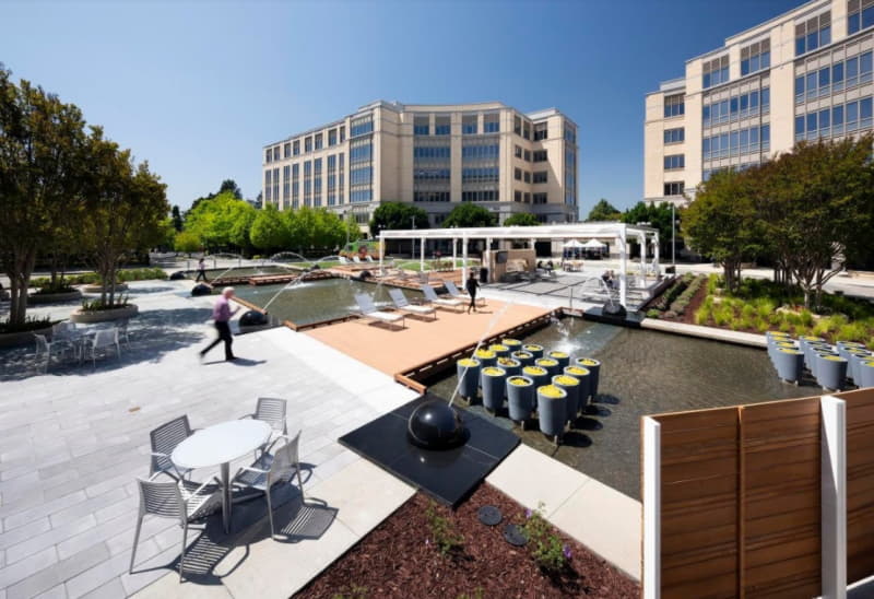 Columbia has redeveloped the campus’s central courtyard into an activated communal outdoor event area called “the Circle.” The enhanced space features a large lighted trellis structure with seating and a food service area, as well as an outdoor fireplace and televisions, new greenery, and a walkway suspended over the campus’s central reflecting pool. Since construction was completed in April, tenants have already begun putting the Circle to good use, and several community events have been scheduled as well, including festivities for Silicon Valley’s GranFondo bicycle race later this month.